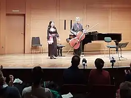 ![]() The pianist with cellist Graham Waterhouse in 2022 | |