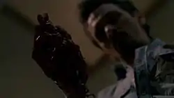 ![]() Phillip Padgett rips out his own heart. To mimic a beating heart, the cast used air pumps to rapidly inflate and deflate the prop. | |