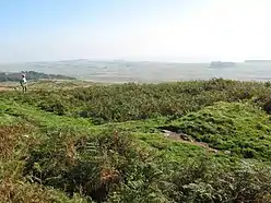 It was excavated by trenching around the inner face, but the original excavators are unknown. It is now visible as a few facing stones and a turf-covered bank, 3.5 metres wide and 0.9 metres high.[1] The agger of the road that leads to the Military Way is 3.5 metres wide and 0.2 metres high.[1]