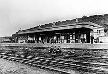 Excavation work was necessary to provide an embankment upon which the approaching track could be laid skirting the shoreline of Hubberston Pill. Public services commenced 7 September 1863. Further track was laid towards the recently constructed docks complex in 1875. A spur to Newton Noyes, known as the 'Estate Line', was completed in 1882. It connected with a pier, which was reached via a lifting bridge at Castle Pill; the junction with the Milford line opposite the station.[5][6] This development highlighted Milford station's less than favorable location, although equidistant between the two major populations of Milford and Hakin, it was at a distance from the quayside and with no discernible pedestrian access. To rectify the issue, the short-lived Hakin Dock Station was constructed in 1898.[5]