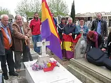 Some women in the milicianas cut their hair in case of capture. They did not want their heads shaved except for tufts that would then have Nationalist ribbons put in them and then being paraded around a town near where they were captured.[2] Nationalists would frequently execute prisoners of war that had been transported to prison. This included executing pregnant milicianas captured in combat.[2] The threat of rape of female combatants was one used regularly by Nationalist forces to discourage their involvement.[18][36] It was a very real threat as it happened as a regular feature for both combatant and non-combatant women, with Moorish soldiers being used in some cases to further the debasement of these women soldiers among their battalions and in the wider population.[18] It also served Nationalist forces to remind all women that they were inferior to men, and that men would easily conquer them.[18] Consequently, when women died on the front, their deaths were often treated not as deaths towards a higher purpose, but a personal loss of honor resulting in death.[18][36] Female fighters caught on the front and given death sentences were often raped before being shot.[37] Franco's treatment of Republican women fighters caught on the front line at times shocked his German allies. He could and did order their execution, and then return to eating breakfast as if nothing special had occurred.[23]