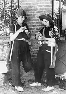 Most women on the front served in militias aligned with some political group. A very small number served as members of the regular Republican army. Members included Esperanza Rodríguez.[2] In the first few months of the war, the Fifth Regiment had the largest contingent of milicianas among all militias.[6] Most of the women serving in front line roles had their positions defined by the communist, anarchist or POUM leadership. Most of these gave women equal roles when it came to combat, and providing the same military contribution.[2] In comparison to men, women on the front were often more expected to take care of injured comrades. This sometimes put them in more harms way, as some women militia members were shot while tending to injured comrades in battle. Women who had to deal with this situation included Josefa Rionda. Captains might also divert women on the battlefield to hospitals, where they expected them to work alongside nurses.[2] In some cases, milicianas were told by column leaders that they were only allowed to remain on the front in support roles for men, by doing working as nurses or teaching largely illiterate militiamen to read. A number of these women left those columns, seeking other units where they could serve in combat.[6] Among the women serving in the international brigades, most worked as nurses, pharmacists or doctors. Some Jewish, Polish and American women did go to Spain, and did serve in combat. They were actively discouraged from doing so by anarchists, and outright banned from doing so by communists.[29]
