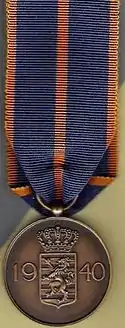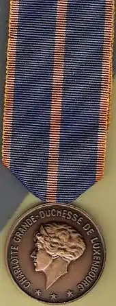 The Military Medal (French: Médaille militaire German: Militärmedaille) is the highest military decoration of Luxembourg. Established on 30 October 1945[2] by Charlotte, Grand Duchess of Luxembourg, at the suggestion of then Prince Jean, it can be awarded for outstanding achievements and extraordinary deeds to all military personnel, without distinction of rank.