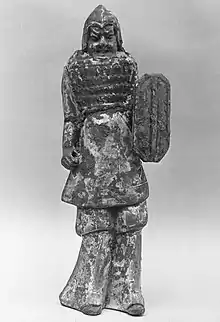 The Book of Sui provides an account of the "first cavalry battalions" of the dynasty's Twenty-four armies. They wore "bright-brilliant" (mingguang) armour made of decarburized steel connected by dark green cords, their horses wore iron armour with dark green tassels, and they were distinguished by lion banners. Other battalions were also distinguished by their own colors, patterns, and flags, but neither the bright-brilliant armour or iron armour are mentioned.[13][14]
