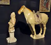 Li Shimin's elite cavalry forces were known to have worn distinctive black "iron clad" armour,[18] but heavy cavalry declined as Turkic influence became more prevalent and light cavalry became the dominant mode of mounted warfare. Tang expeditionary forces to Central Asia preferred a mixture of light and heavy Chinese horse archers. After the An Lushan rebellion of the mid 8th century and losing the northwestern pastures to the Tibetans, Chinese cavalry almost disappeared altogether as a relevant military force.[19] Many southern horses were considered too small or frail to carry an armoured soldier.[20]