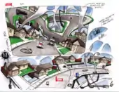 "Milkman Conspiracy," like certain other areas in Psychonauts, takes place in the mind of a person, that of paranoid security guard Boyd Cooper. Boyd is tasked with guarding an asylum and makes frequent references to "the Milkman."[1] The area in his mind is depicted as a suburban neighborhood where the roads are impossibly twisted and cameras can be found everywhere.[1] As players control Raz through this world, the gravity may pull them to different paths and angles. The world is populated by G-Men, who watch protagonist Raz suspiciously while using tools incorrectly in an attempt to blend in while looking for someone called the Milkman. Players collect various tools to try to blend in with G-Men holding the same tools in order to gain access to more parts of the level.[2] In addition to the G-Men, there is also the Rainbow Squirts, a group of children led by a woman called the Den Mother.[3] Raz discovers that the G-Men wish to remove the Milkman from Boyd's mind, while the Rainbow Squirts were trying to keep him contained. The Milkman escapes, saying "I am the milkman. My milk is delicious." and Raz is ejected from Boyd's mind. Boyd assumes the persona of the Milkman in reality before burning down the asylum with a Molotov cocktail. The world has various objects called Figments scattered throughout the area, representing different images such as lawn chairs and children.