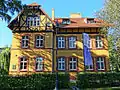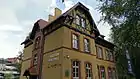 It has one storey with an attic, an elongated rectangle footprint and covered with a gable roof.[13] It is a half-timbered construction. Worth noticing are: