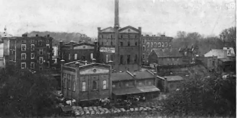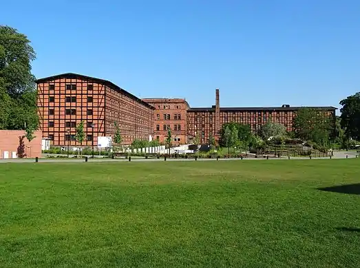 Grain turnover gave rise to new industries, creating needs for new mills and bakeries. In 1825 a consortium took control of mills on Mill Island, trading within local market but also abroad, Germany, Great Britain, and even Brazil.[18] In 1842, Rother's Mills were integrated in a complex of several facilities, renamed Royal Mills, pioneering the first steam engine in Bydgoszcz in 1846. This year is the one of the start of erection of actual Rother's Mills, on the area belonging to merchant Rauber were previously stood gardens.[19] The entire Rother facility has been complete in 1849-1850. The project comprised not only a massive production building, but also: