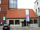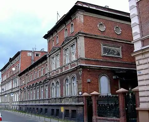 Standing opposite the Mill Bridge, it is the largest preserved granary in Bydgoszcz. Formerly so-called "Mill Camphausen", it has been built by the architect Wolff in 1861.[13] "Mill Camphausen" complex had eight grinding lines, with an annex, a boiler room, a mill windmill, and a granary. The mill was gradually refurbished and expanded: in 1930, the building consisted of a mill, an outbuilding, a boiler house, a turbine, a lock and an airlock, a flour granary, a miller's house, an administration house with a porch and an outhouse and a shed.[12] Behind the building is the beginning of the "Międzywodzie kanal" which parts Mill Island. Originally, adjoined to the Red Granary was set water wheels driving the mill, it was disbanded in 1917 when transitioning to hydroelectric power station.[13] Today the adjacent building, the Miller's House, is fully rehabilitated. In 1975, the Red Granary has been attached to the Regional Museum and accommodated sporadically several art shows between 1998 and 2006.[17] In 2006-2008, it was extensively renovated under the program Restoration of cultural heritage on Mill Island.[6] Since 2009, the Red Granary houses Bydgoszcz Modern Art Gallery.