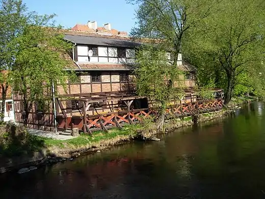 Located on the waterfront of the leat branch, it was built around 1835 following timber framing method, with brick fillings.[13] It was initially used to store bagged grains.[15] The building has an elongated rectangle footprint, with a storey and windows on the roof wystawki.[13] In the 1990s, the granary has undergone thorough renovations. Today it houses the restaurant The Mill Tavern, Polish: Karczma Młyńska.[16] The building has been listed on Kuyavian-Pomeranian Voivodeship Monuments Heritage List, (N°601214, reg.A/773/1-9, June 9, 1992).[14]