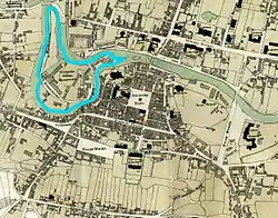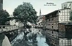 In the Middle Ages, first mills appeared on the eastern part of the island. At the end of the 14th century, for economical and military defense purposes, water network in the western Old Town was improved, so as to take advantage of Brda river first weir, Jaz Farny (literally "Parish weir"), has been created, along with a lock and a navigable channel which is today the actual riverbed of Brda river.[7] Around 1400, opposite Bydgoszcz Cathedral has been built the mill of the church (młyn kościelny). At the time, royal mills belonging to Bydgoszcz starosta, were standing at the junction of the "Międzywodzie kanal" and the leat channel. In 1541, several large five-wheel driven mills and a sawmill were working on the island. In addition to corn and malt mills, there were also fulling mills for wool cleansing and leather tanning.