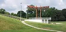 Key design features include a circular lake to contrast the soft natural curves of the surrounding river. The circular lake is defined by a masonry walk at its perimeter and surrounded by flowering trees. An earthen amphitheater, inspired by Native American earthworks found in the Ohio River Valley, is located at the end of a broad field, and forms a crest of land that remains above the water during floods. The covered bridge harkens back to the local history of numerous covered bridges found across the landscape.
