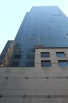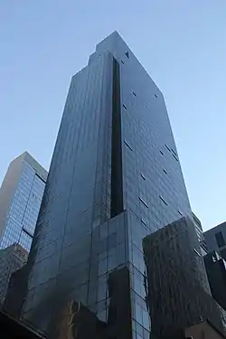 Macklowe acquired the unused air rights of the Hudson Theatre to make the original tower taller than would normally be allowed under zoning laws.[18] The first seven stories of the hotel are made of stone,[19] designed in a classical style to complement the Hudson Theatre.[20][21] The main entrance is at 44th Street, while the convention center entrance is at 45th Street.[22] The 44th Street entrance is flanked by silver sconces and contains a canopy.[23] The rest of the hotel was designed in a modern style because, according to William Derman, it would appeal to "high-tech clients".[20] The facade of the upper stories is made of dark glass.[10]
