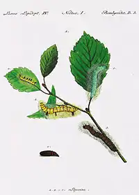 The larva is green, covered in long white or yellow hairs. It feeds on a variety of trees (see list below), often feeding on bark and soft wood. This species overwinters as a pupa, sometimes spending two winters in this form.