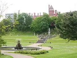 Preston's Avenham Park, Moor Park and Miller Park were inaugurated on the same day that the former Town Hall was opened in 1867. On 28 September 1867 the Preston Chronicle commented that the preparations were in place and that the expectation was that "…….we shall have a gayer, a busier, and a more bustling town than we have had on any previous occasion, excepting, perhaps, at some of our Guilds".[4] The following week's edition for 5 October 1887 devoted several columns to "The Opening of the New Town Hall and Inauguration of the Parks". It was a civic event of considerable size and importance and when the opening ceremony for the town hall was concluded a procession was formed which made its way to Avenham and Miler Parks. Schoolchildren from across Preston had gathered in the parks and it was estimated that 23,000 to 25,000 were present. The Duke of Cambridge, cousin to Queen Victoria, was in attendance and the band of the Third Royal Lancashire Militia entertained the crowds.[5]