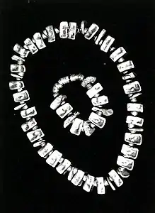 In 1947, Rogers retreated to a small adobe home in Taos, New Mexico, which she referred to as Turtle Walk. While living there, she purchased more than 2,000 Native American artifacts.[1] In addition to collecting, Rogers created designs for jewelry pieces,[4][5] some of which she had commissioned, and some of which she herself made. Her pieces are noted for being bold, modern, and abstract,[6][7] but also draw upon motifs from Europe, Africa, and America.[8]