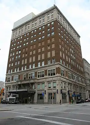 The MAC was housed in nine different buildings before establishing its present clubhouse in 1917.[1] In that year the club constructed the 12-story (13?) building, designed by Armand Koch with its exterior in Neoclassical style, resembling a column with the bottom three stories (the column's base) sheathed in stone veneer, the middle stories plain brick, and the top two in stone veneer - the column's capital. Beneath the veneer is a steel skeleton.[3] In 1954 a renovation of the interior was designed by Eschweiler & Eschweiler, adding the Bali Room, the Men's Lounge, and the Elephant Room.[4]