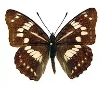 A. nycteis Men. (51c) has less elongate wings than the preceding species [Chitoria ulupi|A. fulva] , differing very considerably from the same, resembling certain species of the genus Athyma on the upperside, especially in the cell of the forewing bearing a white longitudinal streak along the median vein. Underside violet-brown, with the markings of the upperside reappearing, but partly widened and of a white colour which has almost a mother-of-pearl gloss; in the basal area of the hindwing there is anteriorly a long curved white spot, between the middle band and the submarginal row of spots there is a row of bluish white spots in the dark ground-colour. Female similar to male larger, rarely with a row of red-brown spots near the outer margin of the hindwing. An apparently rare form of this species is ab. cassiope Men. (51c), in which the white spots in the central area of the forewing are so much enlarged as to form an almost continuous, broad, strongly curved band; the middle band of the hindwing, too, is essentially dilated. Larva slug-like, dark green, laterally with light oblique stripes, segments 6—12 each with 2 thorny processes, those on segments 6, 8 and 11 being longer and thicker than the others, at the apex of the body 2 long, pointed processes; on the head 2 long thorny horns, which terminate each in 2 roundish knobs directed forward; head and back with single small short thorns, which are longest on the sides of the head, where they also stand more closely together; the parts of the body ventrally of the spiracles clothed with minute yellowish hairs; ventral surface paler than the back; length of the adult larva 52 mm. In June on Elm. Pupa whitish green like that of ilia and iris, but bearing a row of obtuse tubercles on the sharply keeled dorsal side of the abdomen (according to Graeser). — Amurland, Ussuri, Sutchan, Corea.[2]