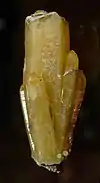 Mimetite is a lead chloride arsenate mineral with the composition Pb5(AsO4)3Cl. It is a secondary mineral, formed by oxidation of primary lead minerals in arsenic-bearing lead deposits.[2] It typically forms short hexagonal crystals that are yellow to brown to orange in color, very brittle, moderately hard (Mohs hardness 3.5-4), and dense (specific gravity 7.24). It is distinctive for its lack of transparency, its resinous to adamantine luster, and its solubility in nitric acid.[5]