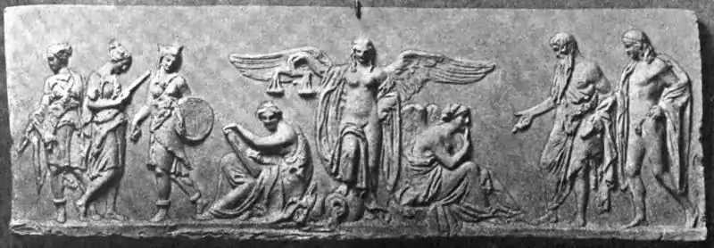 Freund's relief depicts Mimir and Balder consulting the Norns. The composition is very similar to that of Lund's winning entry in the painting category. The two artists were friends but it is not known who was inspired by whom.[2]