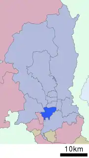 Minami (南区, Minami-ku) is one of the eleven wards in the city of Kyoto, in Kyoto Prefecture, Japan. Its name means "South Ward." It was established in 1955 when it was separated from Shimogyo-ku. As of April, 2016 the ward has an estimated population of 100,781 people. The Kamo River and the Katsura River flow through the district. It is home to several historical places and temples.