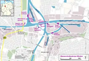 The Northern Link Canal of the Minden Aqueduct is west of the canal bridge and the shortest connection between Mittelland Canal and Weser. It is 1.2 km long and enables an approach to the Abstiegshafen.