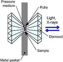 Laboratory work in mineral physics require high pressure measurements. The most common tool is a diamond anvil cell, which uses diamonds to put a small sample under pressure that can approach the conditions in the Earth's interior.