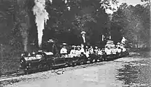 The park’s Miniature Train was hauled by a steam locomotive, which was built like a standard trunk line steam locomotive. The locomotive and its tender were scale models, the passenger cars were open-air. In making its rounds, it stopped periodically to replenish coal and water. Among the engineers were Charlie Thomas, Dick O’Neil, and a person of short stature named George Hawks, who was very popular with his passengers.[2] The trains ran on a circular track laid with 8 pounds per yard (3.97 kg/m) T-rails spiked to miniature sleepers.[3]