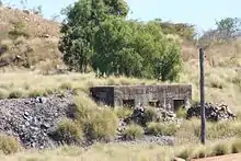 The concrete and brick foundations for a winding engine, boiler and headframe survive as evidence of the mine surface plant. A large pile of mullock now fills and covers the shaft entrance. A concrete lined inground water tank has been constructed on top of the spur overlooking the mine. The demolished remains of a timber-framed cement-sheet clad hut of World War II military origin are located beside the mine on the former telegraph maintenance track. Concrete stamp battery foundations and mill surfaces are situated on a lower level immediately to the south. The mine mullock was adapted during World War II for construction of four form-cast concrete explosives stores which are built into the dump. These stores form part of a large complex of similar wartime structures which are constructed over the south-west slopes of Towers Hill. The place is intersected by an early telegraph route with Siemens Bros. & Co., London, iron telegraph pole bases surviving. Timber poles from later telegraph and telephone route construction are also present.[1]
