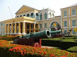 In the front lawns of the building, arranged in a garden display, are a large collection of bronze cannons. The display was initiated by King Vajiravudh (Rama VI, r. 1910–1925), who was probably inspired by his experience at the Royal Military College, Sandhurst.[6] Sixty-three guns were once displayed on the lawn, according to a 1921 survey,[7] but many have been relocated and forty currently remain. Almost all of the cannons bear inscribed names, such as "Uprooter of Phra Sumeru" (ถอนพระสุเมรุ) and "The Wind that destroyeth the Earth" (ลมประไลยกัลป์).[7] The largest and most famous is the Phaya Tani, which was captured from Pattani (then capital of the Pattani Kingdom) in 1786.[6]