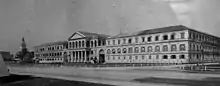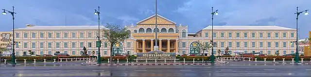 Chulalongkorn worked extensively to modernize the country, including replacing the system of corvée labour with a professional standing military. A regiment known as Thahan Na ("front soldiers"), consisting of about 4,400 men, was created in late 1870s to guard the capital.[3] The need for a permanent residence for the force soon became apparent in the aftermath of a cholera outbreak, during which many soldiers died. The regiment commander Chaomuen Waiworanat (later known as Chaophraya Surasakmontri) accordingly requested that a barracks be built, and construction took place on the site from 1882 to 1884. The building was designed by Italian architect Joachim Grassi, while Surasakmontri oversaw the construction. The building was inaugurated by Chulalongkorn on 18 July 1884.[4] With the formal establishment of the Ministry of Defence in 1887, the building became the ministry's headquarters, a role which it holds to the present.[1]