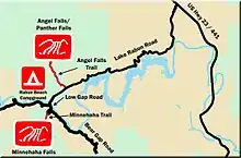 The falls can be reached by a short trail (0.4 miles) from Bear Gap Road called the Minnehaha Trail. The trail is maintained by the U.S. Forest Service.