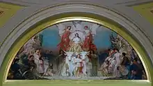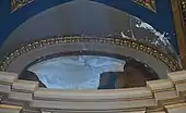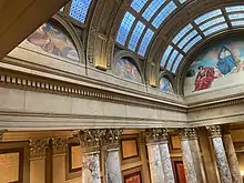 The Minnesota State Capitol underwent a comprehensive restoration project from 2013 to 2017, the first major renovation since the building first opened.[8] The project also included a restoration of the capitol's many works of fine art.[9] This was the first time the murals in the Capitol had comprehensive restoration plan. Before that any restoration work done to the murals was the result of an emergency circumstance or was done by workers often with brush and a pail of water to scrub off the grime accumulated on the murals from smoke, coal dust and other impurities approximately every two decades.[10] Because the delicate murals are secured to their locations nearly all were restored in place. Conservation included extracting grime, old yellowed varnish, and any overpainting done in past restorations using solvents when they could but also applying a variety of small tools. Some murals needed removal from the walls due to the extent of damage and conservation work needed to the mural and/or the wall behind it. Specifically, five of dome's zodiac lunettes and the fourth panel in the Simmons's Civilization of the Northwest mural series in the rotunda required the challenging task of being removed from the walls to conservation labs.[10]