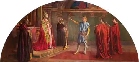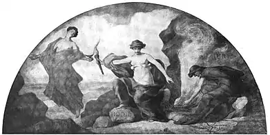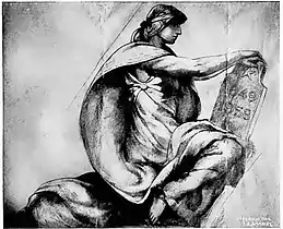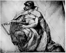 In the planning of the Capitol building from 1896 to 1905, its architect Cass Gilbert had envisioned marble and bronze statuary on the exterior and numerous artworks in the interior.[3] Gilbert sought out many of the finest artists of the period, such as Kenyon Cox, Elmer Garnsey, Edwin Howland Blashfield, Henry Oliver Walker, Edward Emerson Simmons, John La Farge, Douglas Volk, Francis D. Millet, Howard Pyle, and Rufus Fairchild Zogbaum.