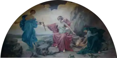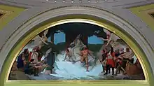 In the south lunette Discoverers and Civilizers Led to the Source of the Mississippi, a mural that historian capitol Denis Gardner describes as, "among the most explicitly Eurocentric paintings in the capitol. Manitou or Great Spirit begins the flow of the Mississippi River by pouring water from an urn. It is a romanticized depiction of American Indians that minimalizes their contributions to Minnesota history."[69] The painting depicts a Native American man and woman in front of the spirit Manitou in the center at the Mississippi's headwaters. They are surrounded on one side by "discoverers" on the right and "civilizers" on the left who are guided from above by angelic beings signifying divine manifest destiny. On the left guided by the "Spirit of Civilization" a priest "offers salvation in the form of a crucifix."[70] Behind the priest squats a man restraining two irate dogs. On the right are the explorers, led by the "Spirit of Discovery", who holds a compass.[66][70] The painting has been controversial and has been described as both "offensive and a false representation of customs."[71][72]