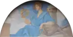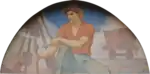 In both murals, Blashfield represented a central symbolic figure. In the north lunette, Minnesota: Granary of the World shows Minnesota as a breadbasket and a leader in agriculture. In the center, riding on the top of a cart filled with corn and wheat and pulled by oxen is a seated woman representing Minnesota who was modeled after a popular actress of the time, Mary Anderson.[66] Civil War soldiers on the right side of the mural communicate the state's contribution to preserving the Union. On the left side of the mural is a seated male figure on what was a modern tractor for the time, demonstrating the transition to mechanization. In a move reminiscent of the European practice of artists portraying their patrons in their works, Blashfield added profiles of the Capitol's architect, Cass Gilbert, and the vice president of the Board of Capitol Commissioners, Channing Seabury.[67][68]