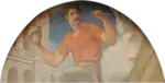 Roughly twenty-eight feet long and thirteen feet in height and over ninety feet from the rotunda floor the four-panel set titled Civilization of the Northwest: The American Genius on the rotunda walls is the largest of all the murals in the Capitol. The murals were completed by Edward Simmons, an American Impressionist painter, a member of the Ten American Painters, who, as a group, seceded from the Society of American Artists.[37] The commission to paint the murals was both a surprise to Simmons as well as one of the largest undertakings he ever did. In a romantic manner, it demonstrates an idealized turn-of-the-19th century chronicle of Minnesota's evolution. The first panel represents the young man leaving home; the second, the cleaning up of the land; the third, breaking the soil, which he does by lifting a great stone out of a hole from which issues a young girl bearing maize; and in the last panel, the young man is crowned and sends the four winds to the four quarters of the globe bearing the gifts of Minnesota. In every panel he is accompanied by Hope and in all but the last panel he is accompanied by Minerva (Wisdom). In the last panel having acquired Wisdom, Minerva is now gone and her shield is at his feet.[38]