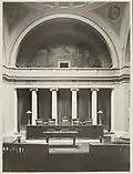 Adding the sculptural group walled off not only spectators' gallery but it also obscured the allegorical figures of History and Records, painted by W. A. Mackay painted on either side of the arch, which were paneled and painted over.