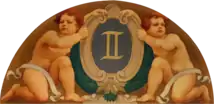 The dome is divided into twelve vertical panels. Shallow penetrations at the base of the dome form lunettes over each of the twelve windows, in which two putti hold a framed symbol of the zodiac which suggests the constellations in the skies above. All were designed by Elmer Garnsey and painted by his assistant Arthur Willett.[23]