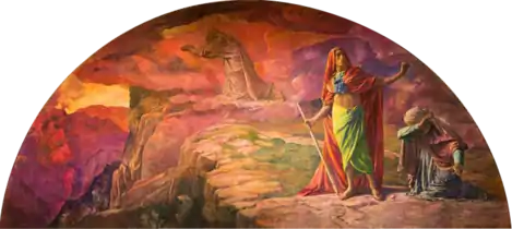 The mural Moral and Divine Law was modified probably in the 1930s. A doorway around which the lunette had been installed was enclosed and the mural was then painted to blend into the new composition.[61]