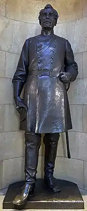 Minnesota sculptor John Karl Daniels did both the Alexander Wilkin and John B. Sanborn statues. These were the first of several statues he did at the Capitol including three on the Capitol grounds, Knute Nelson in 1928, Leif Erikson in 1949, and the Earthbound Monument in 1956.[25] The statue of James Shields by Chicago artist Frederick Cleveland Hibbard is a second casting with the original at the Carroll County Courthouse, Carrollton, Missouri. Because the original design work had been paid for by a state appropriation of $10,000 from the Missouri Legislature, Minnesota veteran groups were able to get a second casting from Daniels for $1,450 for placement in the Capitol rotunda.[26][27]