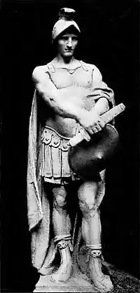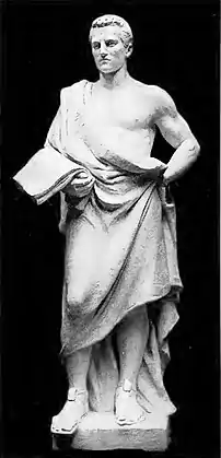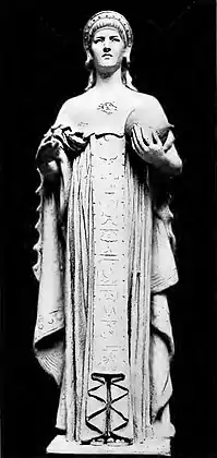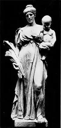 The six marble figures on the façade located just under the Quadriga represent "the six virtues that support and assist the progress of the state – the underlying virtues of good citizenship," as explained in the 1907 official guide to the State Capitol endorsed by Gilbert. The four female and two male figures represent Wisdom, Courage, Bounty, Truth, Integrity, Prudence.[19] According to custom in the turn-of-the-nineteenth-century, French did not carve the statues himself but rather modeled them in clay at half-size, then skilled stone cutters worked, shaped, and carved them in marble on the grounds of the Capitol. A failure in communication resulted in the delivered marble blocks for the Virtues were too small for the planned size of the statues. The resulting statues were reduced to a height of 65 inches rather than the planned 96 inches.[20] The original marble statues, which had deteriorated from the effects of weather and pollution were replaced by marble replicas carved in the 1970s.[21] The original plaster models for the virtues have dissipated over time. While the provenances for Wisdom and Truth have been tracked down, the models for Courage, Bounty, Integrity, and Prudence have vanished. Wisdom is located in collections of the Boston Athenaeum and Truth is at the collections in Art Institute of Chicago.[22]
