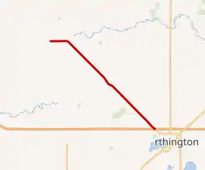 The roadway was paved between Reading and Worthington at the time it was marked.[5] The remainder was paved in 1950.[6] It originally terminated at U.S. Highway 16 (now County State-Aid Highway 35) until that part of it was replaced by Interstate 90 in 1969.[7] It then ran into Worthington city proper along Diagonal Road, terminating at U.S. 59 / State Highway 60. It was shortened to end at I-90 in the late 1980s.[8][9]