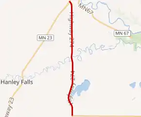 The highway's original northern terminus was at State Highway 67 until Highway 23 was rerouted between Hanley Falls and Granite Falls circa 1980.[5][6]