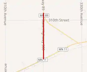 Highway 308 is the short west leg of a "Y" joining Highway 11 to Highway 89 northbound. The roadway follows 320th Avenue for 1.3 mile in Roseau County.