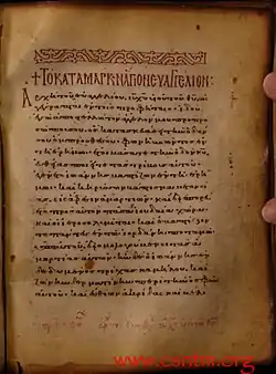 The text is divided according to the κεφαλαια (chapters), whose numbers are given in the margin, and their τιτλοι (titles of chapters) at the top of the pages. There is also a division according to the Ammonian Sections, with references to the Eusebian Canons (written below Ammonian Section numbers).[4]