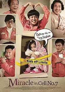 Miracle in Cell No. 7 (Korean: 7번방의 선물; RR: 7beonbangui Seonmul; lit. "A Gift from Room 7") is a 2013 South Korean comedy-drama film starring Ryu Seung-ryong, Kal So-won and Park Shin-hye.[2][3] The film is about a mentally challenged man wrongfully imprisoned for murder, who builds friendships with the hardened criminals in his cell, who in return help him see his daughter again by smuggling her into the prison.
