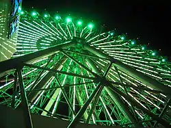 On the roof of Miramar Entertainment Park is a 70 meters (230 ft) tall ferris wheel, third tallest in Taiwan after the 88 meters (289 ft) Sky Wheel at Janfusun Fancyworld and Sky Dream in Lihpao Land.[1] The building and wheel combined have a total overall height of 100 meters (330 ft), making it previously the highest overall in Taiwan, but now superseded by the Dream Mall ferris wheel (Kaohsiung Eye) in Kaohsiung, a smaller 50 meters (160 ft) diameter wheel on a taller building which opened in May 2007.