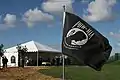 Ceremony attendees gather before the start of a burial while the iconic Prisoner of War/Missing in Action flag waves over the grounds.
