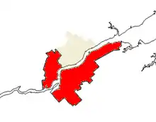 The riding of Miramichi (red) in relation to the balance of the city of Miramichi (gold).